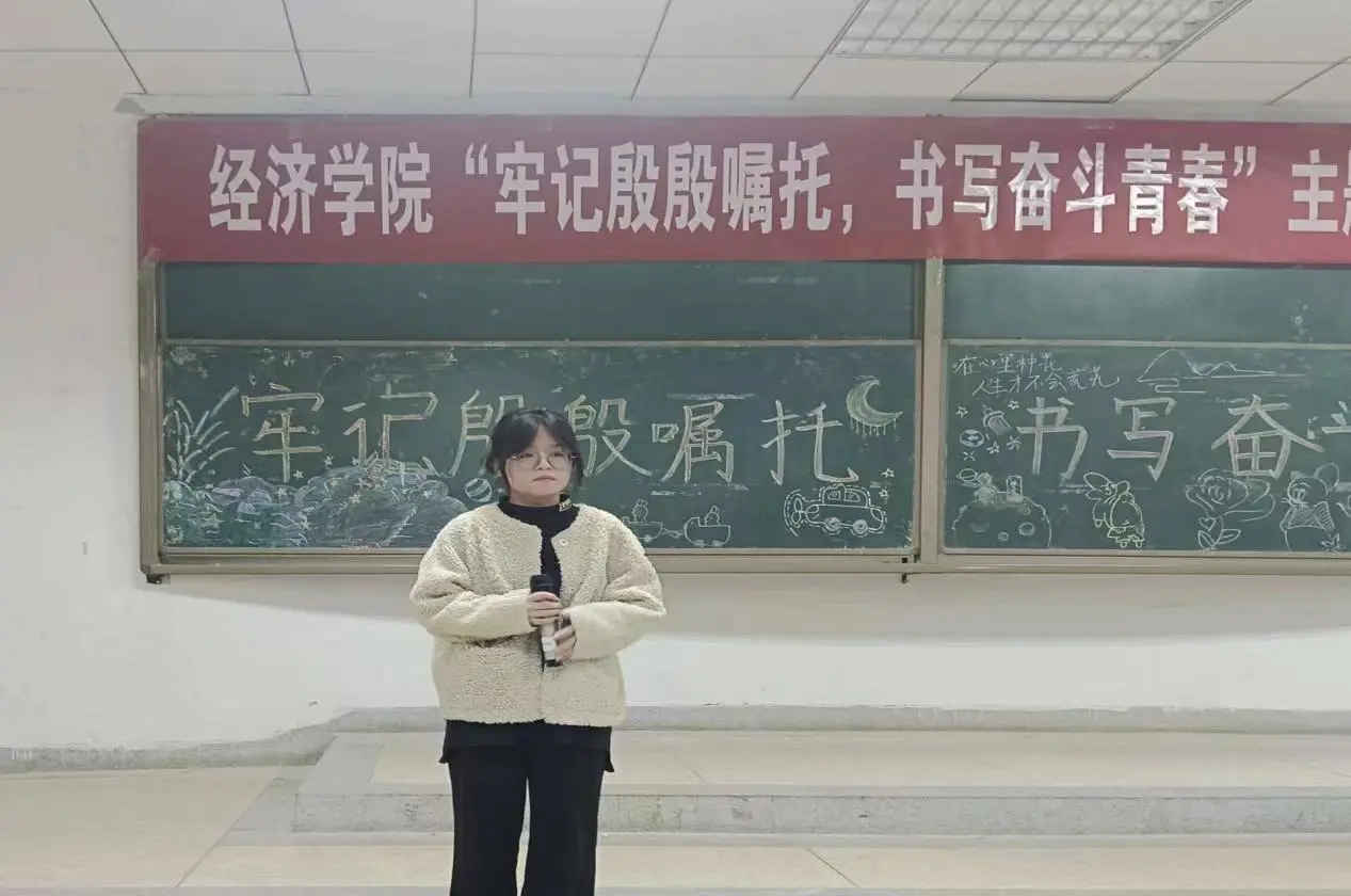 23级经济学一班学生代表王亚男带来《牢记殷殷嘱托·书写奋斗青春》的主题演讲,她用铿锵有力的语言向我们展示了当代青年生逢盛世重任在肩,以实现中华民族伟大复兴为己任的满腔热情。